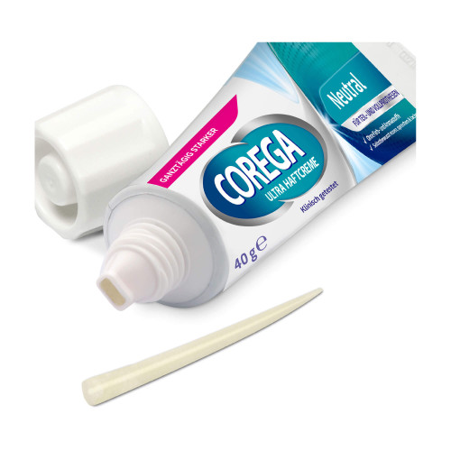 Sie suchen nach einer Haftcreme ohne künstliche Farb- und Aromastoffe, sodass die Haftcreme den Genuss Ihrer Mahlzeiten nicht beeinflusst? Die Corega Ultra Haftcreme Neutral ist Teil des Corega Ultra Haftcreme Sortiments an zinkfreien Haftcremes, welche für sicheren Halt, extra Beißkraft* sowie Speisereste-Schutz sorgen. Diese Haftcreme ist außerdem frei von künstlichen Farb- und Aromastoffen. So steht Ihrem Wunsch, Ihre Lieblingsspeisen wie gewohnt zu genießen, nichts im Wege. Unsere Ultra Haftcremes bieten einen ganztägigen sicheren Halt, der für einen festen Sitz Ihrer Zahnprothesen sorgt und diese gegen das Eindringen von Speiseresten zwischen Prothese und Zahnfleisch versiegelt. Und da Ihr herausnehmbarer Zahnersatz den ganzen Tag lang fest sitzt, können Sie befreit und herzhaft lachen.