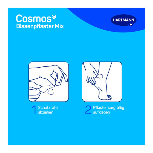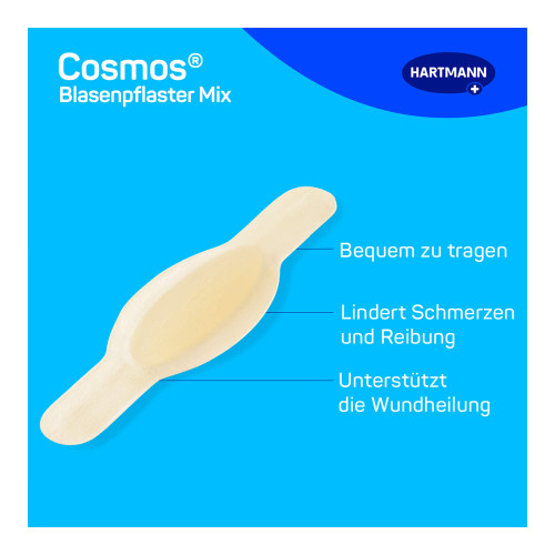 Cosmos Blasenpflaster sind bequem zu tragen und haften vollflächig auf der betroffenen Körperstelle. Die verschiedenen Größen im cosmos Blasenpflaster-Mix lassen eine flexible Anwendung an verschiedenen Körperstellen zu.