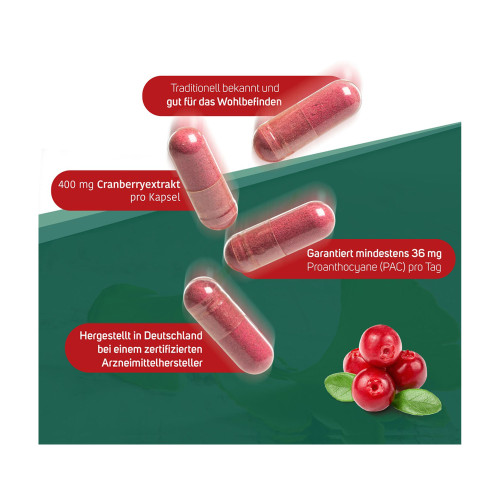 Cranberryextrakt, Trägerstoff: Maltodextrin, Gelatine (Kapselhülle), Trennmittel: Magnesiumhydroxid, Tri-Calciumphosphat und Magnesiumsalze der Speisefettsäuren (pflanzlich); Maltodextrin.