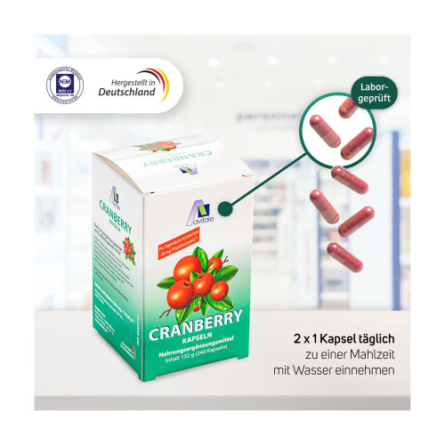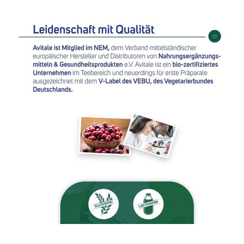 Nur in den Avitale Cranberry Kapseln kommt auch das original Cranberryextrakt zum Einsatz. Diese eigens für die Avitale Cranberry-Produkte komponierte Mischung enthält nur beste Rohstoffe erster Qualität und wird von einem zertifzierten deutschen Arzneimittelhersteller sorgsam verarbeitet.