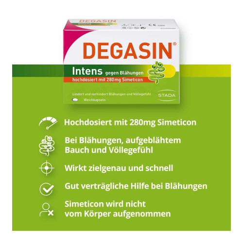 - DEGASIN® Intens ist mit 280 mg Simeticon ein hochdosiertes Simeticon-Präparat bei Blähungen und gasbedingte Beschwerden.