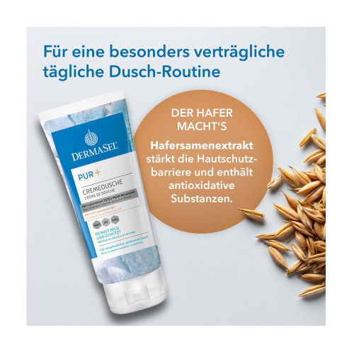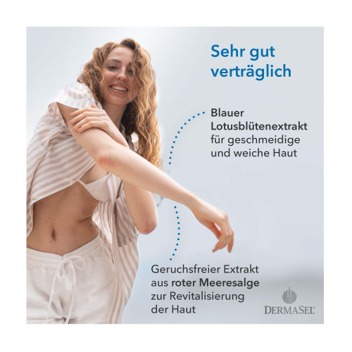 Schon in der Antike galt ein Bad im Toten Meer als gesundheitsfördernd und hilfreich bei Hautproblemen. DermaSel® PUR+ CREMEDUSCHE mit naturreinen TOTES MEER Mineralien plus Hafersamen- und Algenextrakt sowie blauem Lotus reinigt mild und schützt. Sie unterstützt den Feuchtigkeitshaushalt der Haut und mindert das Trockenheitsgefühl. Für gepflegte Haut, schon beim Duschen. Das Produkt ist vegan. Dermatologisch geprüft.