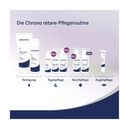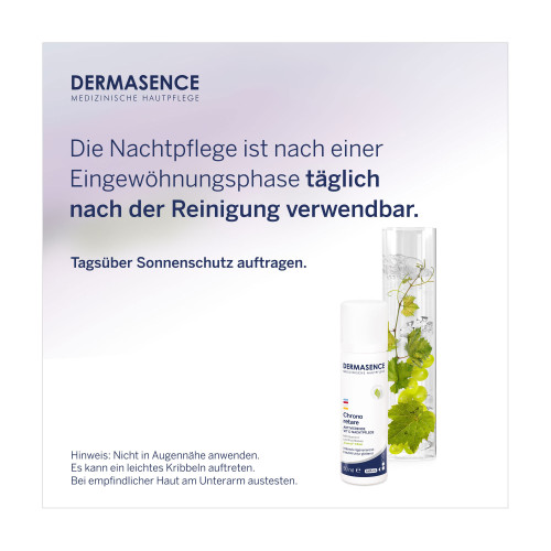 Zur intensivierten Feuchtigkeitsversorgung der Haut kann die Nachtpflege mit dem Dermasence Chrono retare Anti-Aging-Serum (PZN 13831642) kombiniert werden. Ideal zur Vorbereitung der Haut auf Fruchtsäure-Peelings.
