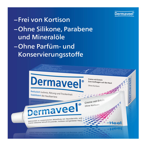 Dermaveel® zeichnet sich durch eine besondere Zusammensetzung aus. Es enthält 5,5% Ectoin. Ectoin ist ein natürliches Zellschutzmolekül, das Wasser in der Haut speichert, trockene Haut wieder mit der notwendigen Feuchtigkeit versorgt und so den Juckreiz lindert. Ectoin bindet fast doppelt so viel Wasser wie Urea.*