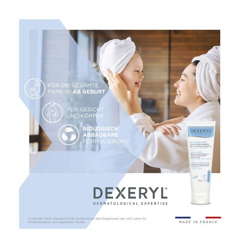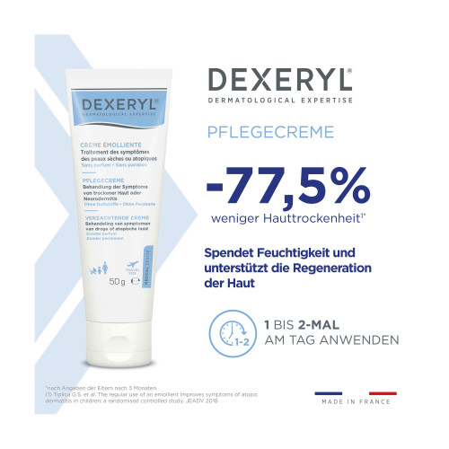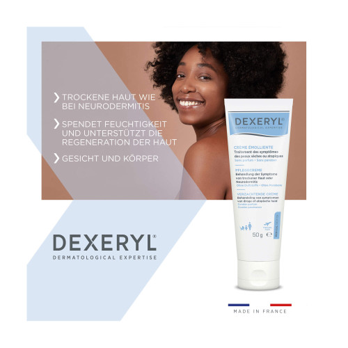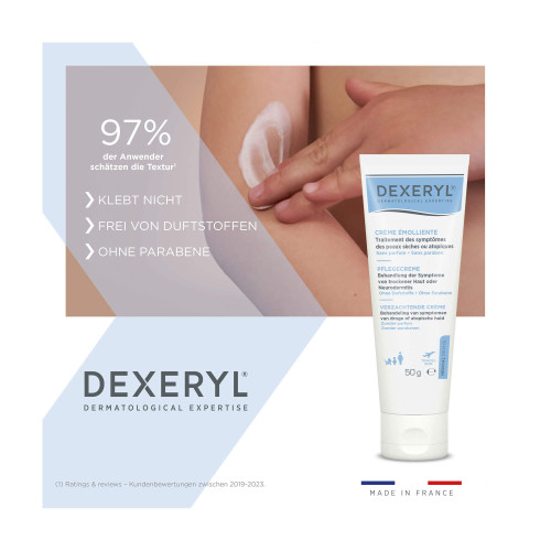 Die DEXERYL® Pflegecreme ist eine intensiv feuchtigkeitsspendende Hautpflegecreme. Sie wurde speziell für die Bedürfnisse von trockener Haut sowie für Personen mit Hauterkrankungen wie Neurodermitis und Ichthyose entwickelt. Die medizinische Hautpflegecreme versorgt die Haut nachhaltig mit Feuchtigkeit und unterstützt die Wiederherstellung der natürlichen Schutzbarriere der Haut. Sie eignet sich für den täglichen Gebrauch bei Erwachsenen und Jugendlichen. Sogar für Kleinkinder und Säuglinge ist die Creme geeignet.