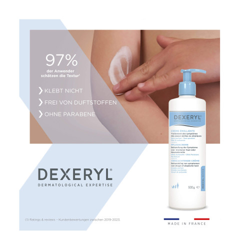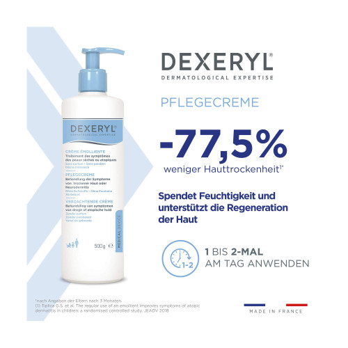Die DEXERYL® Pflegecreme ist eine intensiv feuchtigkeitsspendende Hautpflegecreme. Sie wurde speziell für die Bedürfnisse von trockener Haut sowie für Personen mit Hauterkrankungen wie Neurodermitis und Ichthyose entwickelt. Die medizinische Hautpflegecreme versorgt die Haut nachhaltig mit Feuchtigkeit und unterstützt die Wiederherstellung der natürlichen Schutzbarriere der Haut. Sie eignet sich für den täglichen Gebrauch bei Erwachsenen und Jugendlichen. Sogar für Kleinkinder und Säuglinge ist die Creme geeignet.