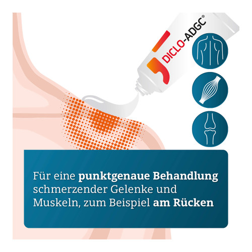 DICLO-ADGC® Schmerzgel forte 20 mg/g Gel. Wirkstoff: Diclofenac (als Diclofenac-N-Ethylethanamin). Anwendungsgebiete: Für Erwachsene und Jugendliche ab 14 Jahren. Zur kurzzeitigen lokalen, symptomatischen Behandlung von leichten bis mäßig starken Schmerzen bei akuten Zerrungen, Verstauchungen oder Prellungen infolge eines stumpfen Traumas. Warnhinweis: Enthält Butylhydroxytoluol und einen Duftstoff mit Benzylalkohol (0,15 mg/ml), Citronellol, Geraniol, Linalool, D-Limonen, Citral, Farnesol, Cumarin, Eugenol.