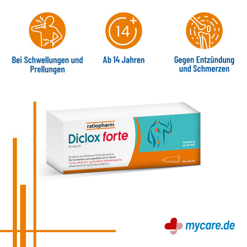 Diclox forte. Wirkstoff: Diclofenac-N-Ethylethanamin. Anwendungsgebiete: Für Erwachsene und Jugendliche ab 14 Jahren: Zur lokalen, symptomatischen Behandlung von Schmerzen bei akuten Zerrungen, Verstauchungen oder Prellungen infolge eines stumpfen Traumas. Warnhinweise: Enthält Butylhydroxytoluol und einen Duftstoff mit Benzylalkohol (0,15 mg/g), Citronellol, Geraniol, Linalool, D-Limonen, Citral, Farnesol, Cumarin und Eugenol.