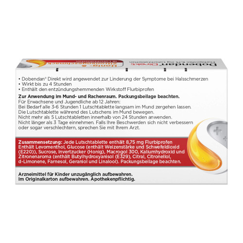Dobendan® Direkt Flurbiprofen 8,75 mg Lutschtabletten. Wirkstoff: Flurbiprofen. Anwendungsgebiete: Zur kurzzeitigen symptomatischen Behandlung bei schmerzhaften Entzündungen der Rachenschleimhaut bei Erwachsenen und Kindern ab 12 Jahren. Warnhinweise: Enthält Levomenthol, Sucrose, Glucose und Honig.