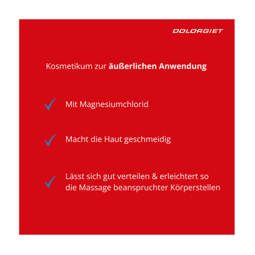 Das Dolorgiet aktiv Magnesium Spray wurde entwickelt, um die Massagewirkung zu unterstützen und gleichzeitig die Haut zu pflegen. Die Formulierung enthält über 30% Magnesiumchlorid, das aus 1.600 Metern Tiefe gewonnen wird. Sie macht die Haut geschmeidig, erleichtert das Einmassieren und sorgt dank des frischen Dufts für ein angenehmes Pflegeerlebnis.