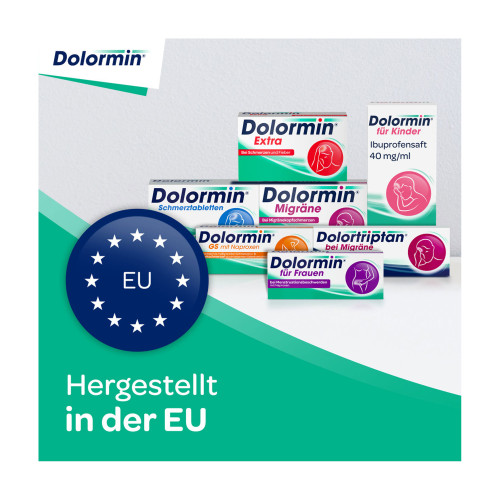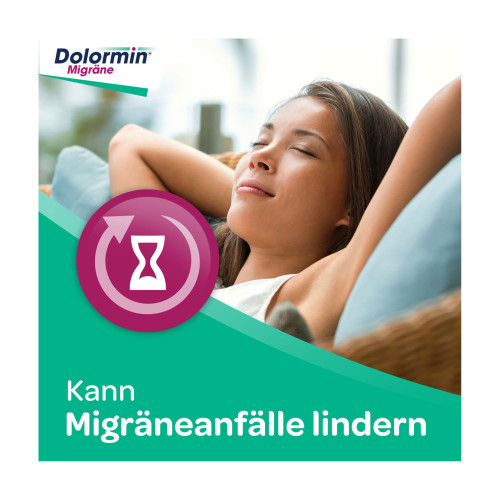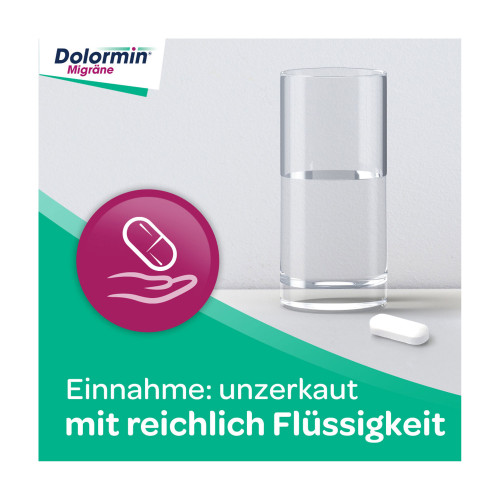 Dolormin® Migräne Filmtabletten. Wirkstoff: Ibuprofen als Ibuprofen-DL-Lysin (1:1). Anwendungsgebiete: Symptomatische Behandlung der akuten Kopfschmerzphase bei Migräne mit und ohne Aura. Für Kinder ab 20 kg Körpergewicht (6 Jahre und älter), Jugendliche und Erwachsene. Warnhinweise: Ohne ärztlichen Rat nicht länger anwenden als in der Packungsbeilage vorgegeben!