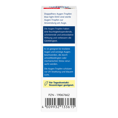 Doppelherz Augen-Tropfen blue light DUO ist ein Medizinprodukt zur Anwendung am Auge. Es ist steril, konservierungsmittelfrei und enthält Hyaluronsäure, Rosmarinsäure und Vitamin B12. Die Augen-Tropfen haben eine feuchtigkeitsspendende, schmierende und antioxidative Wirkung und erhöhen die Gleitfähigkeit.