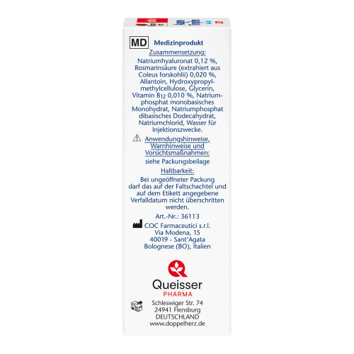 Natriumhyaluronat 0,12 %, Rosmarinsäure (extrahiert aus Coleus forskohlii) 0,020 %, Allantoin, Hydroxypropylmethylcellulose, Glycerin, Vitamin B12 0,010 %, Natriumphosphat monobasisches Monohydrat, Natriumphosphat dibasisches Dodecahydrat, Natriumchlorid, Wasser für Injektionszwecke.