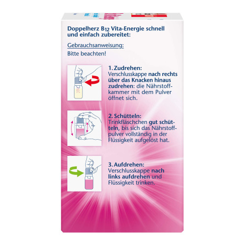 Doppelherz B12 Vita-Energie enthält 450 µg hochdosiertes Vitamin B12 in Kombination mit drei ausgesuchten B-Vitaminen und den Eiweißbausteinen L-Glutamin und L-Serin.