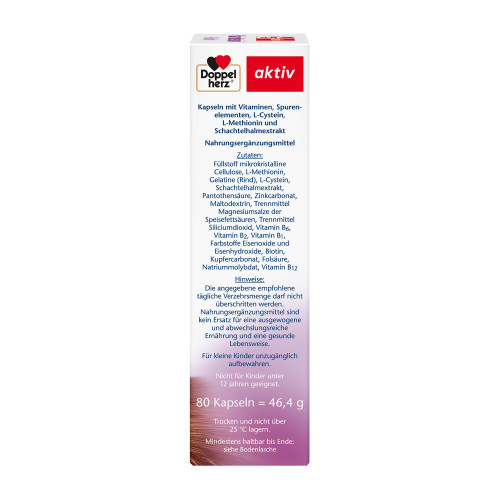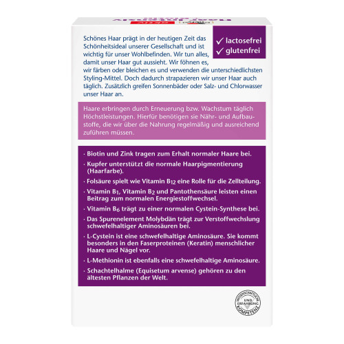 Füllstoff mikrokristalline Cellulose, L-Methionin, Gelatine (Rind), L-Cystein, Schachtelhalmextrakt, Pantothensäure, Zinkcarbonat, Maltodextrin, Trennmittel Magnesiumsalze der Speisefettsäuren, Trennmittel Siliciumdioxid, Vitamin B6, Vitamin B2, Vitamin B1, Farbstoffe Eisenoxide und Eisenhydroxide, Biotin, Kupfercarbonat, Folsäure, Natriummolybdat, Vitamin B12.