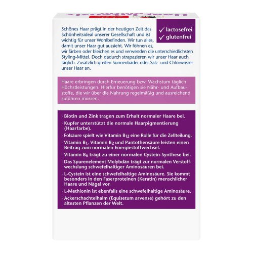 Füllstoff mikrokristalline Cellulose, L-Methionin, Gelatine (Rind), L-Cystein, Schachtelhalmextrakt, Pantothensäure, Zinkcarbonat, Maltodextrin, Trennmittel Magnesiumsalze der Speisefettsäuren, Trennmittel Siliciumdioxid, Vitamin B6, Vitamin B2, Vitamin B1, Farbstoffe Eisenoxide und Eisenhydroxide, Biotin, Kupfercarbonat, Folsäure, Natriummolybdat, Vitamin B12.
