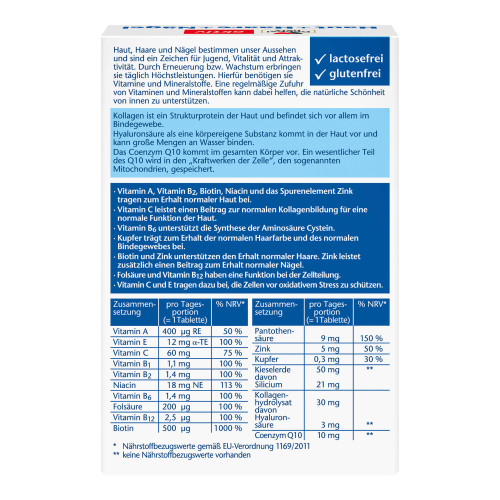 Füllstoff mikrokristalline Cellulose, Vitamin C, Kieselerde, hyaluronsäurehaltiges Kollagenhydrolysat, Niacin, Vitamin E, Füllstoff Cellulosepulver, Füllstoff vernetzte Carboxymethylcellulose, Trennmittel Siliciumdioxid, Überzugsmittel Hydroxypropylmethylcellulose, Pantothensäure, Coenzym Q10, Trennmittel Magnesiumsalze der Speisefettsäuren, Zinkoxid, Trennmittel Magnesiumhydroxidcarbonat, Farbstoff Calciumcarbonat, Füllstoff Hydroxypropylcellulose, Trennmittel Talkum, Überzugsmittel Polyethylenglycol, Vitamin B6, Vitamin B2, Vitamin B1, Farbstoff Eisenoxide und Eisenhydroxide, Kupfersulfat Vitamin A, Biotin, Folsäure, Vitamin B12.