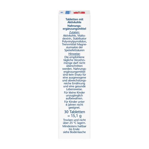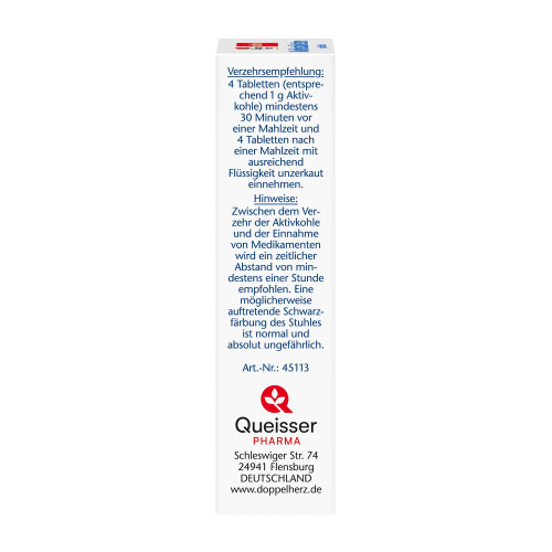 4 Tabletten (entsprechend 1 g Aktivkohle) mindestens 30 Minuten vor einer Mahlzeit und 4 Tabletten nach einer Mahlzeit mit ausreichend Flüssigkeit unzerkaut einnehmen.