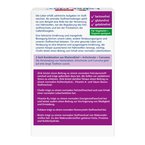 Cholinbitartrat, Überzugsmittel Hydroxypropylmethylcellulose, Mariendistelextrakt, Curcumawurzelpulver, Maltodextrin, Artischockenextrakt, Zinkgluconat, Trennmittel Magnesiumsalze der Speisefettsäuren, Vitamin B2, Folsäure, Biotin.
