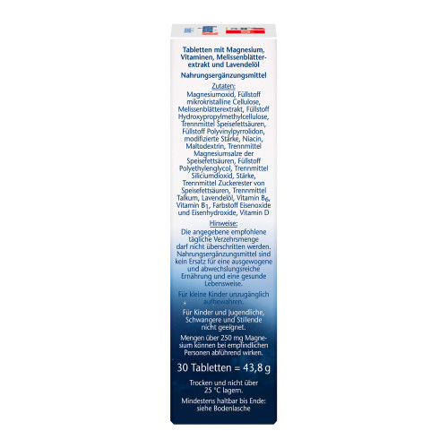 Magnesiumoxid, Füllstoff mikrokristalline Cellulose, Melissenblätterextrakt, Füllstoff Hydroxypropylmethylcellulose, Trennmittel Speisefettsäuren, Füllstoff Polyvinylpyrrolidon, modifizierte Stärke, Niacin, Maltodextrin, Trennmittel Magnesiumsalze der Speisefettsäuren, Füllstoff Polyethylenglycol, Trennmittel Siliciumdioxid, Stärke, Trennmittel Zuckerester von Speisefettsäuren, Trennmittel Talkum, Lavendelöl, Vitamin B6, Vitamin B1, Farbstoff Eisenoxide und Eisenhydroxide, Vitamin D.