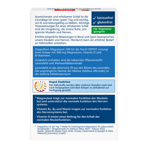 Doppelherz Magnesium 500 für die Nacht DEPOT versorgt Ihren Körper mit 500 mg Magnesium, Vitamin D und B-Vitaminen. Zusätzlich enthalten sind die bekannten Pflanzenstoffe Lavendelöl und Melissenextrakt.