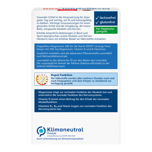 Doppelherz Magnesium 500 für die Nacht DEPOT versorgt Ihren Körper mit 500 mg Magnesium, Vitamin D und B-Vitaminen. Zusätzlich enthalten sind die bekannten Pflanzenstoffe Lavendelöl und Melissenextrakt.