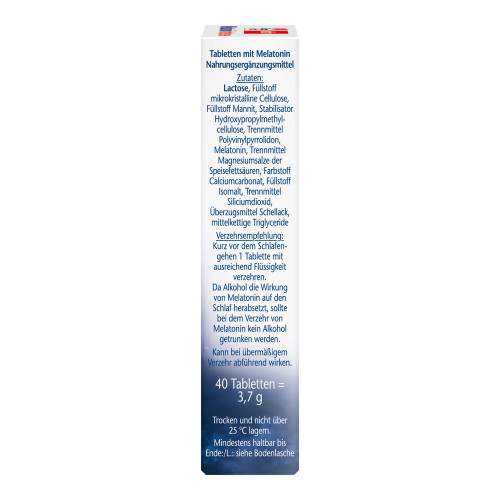 Lactose, Füllstoff mikrokristalline Cellulose, Füllstoff Mannit, Stabilisator Hydroxylpropylmethylcellulose, Trennmittel Polyvinylpyrrolidon, Melatonin, Trennmittel Magnesiumsalze der Speisefettsäuren, Farbstoff Calciumcarbonat, Füllstoff Isomalt, Trennmittel Siliciumdioxid, Überzugsmittel Schellack, mittelkettige Triglyceride.