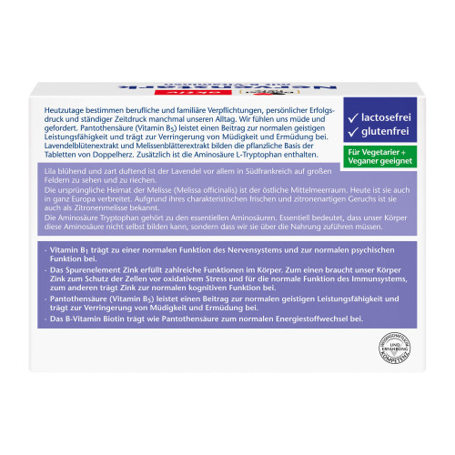 Füllstoff mikrokristalline Cellulose, Melissenblätterextrakt, L-Tryptophan, Maltodextrin, Lavendelblütenextrakt, Trennmittel Siliciumdioxid, Füllstoff Cellulosepulver, Überzugsmittel Hydroxypropylmethylcellulose, Füllstoff vernetzte Carboxymethylcellulose, Pantothensäure, Trennmittel Magnesiumhydroxidcarbonat, Trennmittel Magnesiumsalze der Speisefettsäuren, Farbstoff Calciumcarbonat, Trennmittel Talkum, Füllstoff Hydroxypropylcellulose, Überzugsmittel Polyethylenglycol, Zinkoxid, Vitamin B1, Farbstoff Eisenoxide und Eisenhydroxide, Biotin.