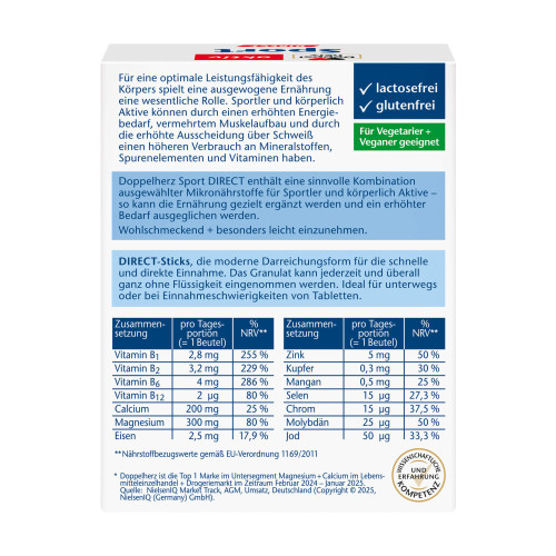 Durch ein modernes Herstellungsverfahren ist es gelungen, eine moderne und praktische Darreichungsform zu entwickeln: Doppelherz Sport DIRECT enthält seine wertvollen Mikronährstoffe in Form von Granulat: Den Portionsbeutel aufreißen, den Inhalt direkt auf die Zunge geben und das feine Granulat löst sich in Sekundenschnelle auf. Somit kann es jederzeit und an jedem Ort ganz ohne Flüssigkeit eingenommen werden.
