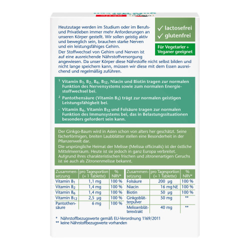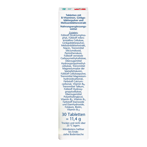 Füllstoff Dicalciumphosphat, Füllstoff mikrokristalline Cellulose, Ginkgoblätterextrakt, Melissenblätterextrakt, Niacin, Trennmittel Siliciumdioxid, Pantothensäure, Füllstoff vernetzte Carboxymethylcellulose, Überzugsmittel Hydroxypropylmethylcellulose, Trennmittel Magnesiumsalze der Speisefettsäuren, Füllstoff Cellulosepulver, Trennmittel Magnesiumhydroxidcarbonat, Farbstoff Calciumcarbonat, Vitamin B6, Trennmittel Talkum, Füllstoff Hydroxypropylcellulose, Überzugsmittel Polyethylenglycol, Vitamin B2, Vitamin B1, Farbstoff Eisenoxide und Eisenhydroxide, Folsäure, Biotin, Vitamin B12.