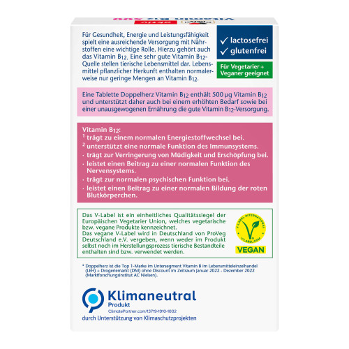 Der menschliche Körper kann Vitamin B12 nicht selbst herstellen und muss es über die Nahrung aufnehmen. Bei erhöhtem Bedarf, etwa im Alter oder durch eine rein vegane Ernährung, empfiehlt sich die Nahrungsergänzung von Doppelherz. Eine Mini-Tablette enthält 500 Mikrogramm hochdosiertes Vitamin B12 und hilft daher bei der Versorgung mit dem Vitamin.