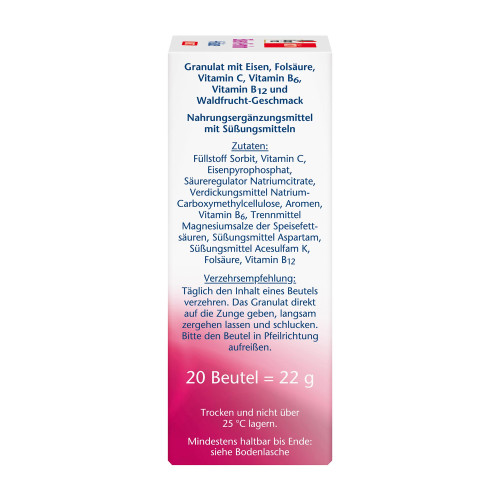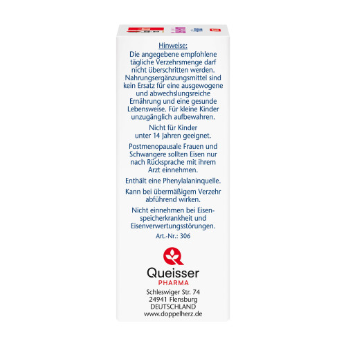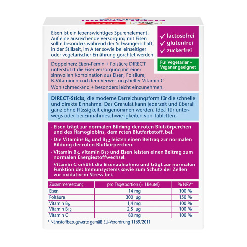 Doppelherz Eisen-Femin + Folsäure DIRECT unterstützt die Eisenversorgung mit einer sinnvollen Kombination aus Eisen, Folsäure, B-Vitaminen und dem Verwertungshelfer Vitamin C. Wohlschmeckend + besonders leicht einzunehmen.