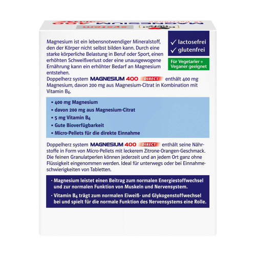 Doppelherz system MAGNESIUM 400 DIRECT enthält 400 mg Magnesium, davon 200 mg aus Magnesium-Citrat in Kombination mit Vitamin B6. Magnesium trägt zu einer normalen Muskelfunktion und Vitamin B6 zur normalen Funktion des Nervensystems bei.