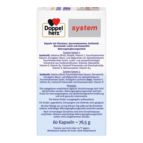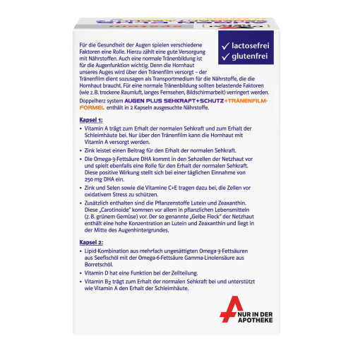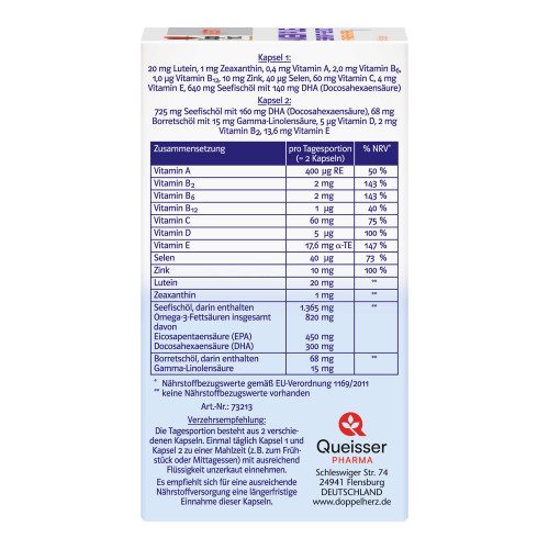 Kapsel 1: Seefischöl, Gelatine (Rind), pflanzliche Öle (Distel, Sonnenblumen), L-Ascorbinsäure, Feuchthaltemittel Glycerin, Emulgator Mono- und Diglyceride von Speisefettsäuren, Feuchthaltemittel Sorbit, lutein- und zeaxanthinhaltiges Konzentrat aus Studentenblumen, Emulgator Lecithine (Soja), Zinkoxid, Stärke, D-alpha-Tocopherol, Pyridoxinhydrochlorid, Farbstoff Eisenoxide und Eisenhydroxide, Retinylpalmitat, Natriumselenit, Cyanocobalamin.