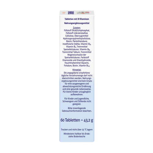 Füllstoff Dicalciumphosphat, Füllstoff mikrokristalline Cellulose, Überzugsmittel Hydroxypropylmethylcellulose, Niacin, Pantothensäure, modifizierte Stärke, Vitamin B2, Vitamin B1, Trennmittel Speisefettsäuren, Vitamin B6, Trennmittel Talkum, Trennmittel Magnesiumsalze der Speisefettsäuren, Farbstoff Eisenoxide und Eisenhydroxide, Feuchthaltemittel Glycerin, Folsäure, Biotin, Vitamin B12.