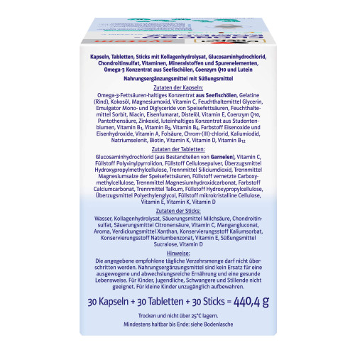 Nahrungsergänzungsmittel mit Kollagenhydrolysat, Glucosaminhydrochlorid, Chondroitinsulfat, Vitaminen, Mineralstoffen und Spurenelementen, Omega-3 Konzentrat aus Seefischölen, Coenzym Q10 und Lutein.