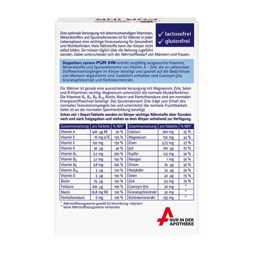 Doppelherz system FÜR IHN enthält sorgfältig ausgesuchte Vitamine, Mineralstoffe und Spurenelemente von Vitamin A - Zink, die an zahlreichen Stoffwechselvorgängen im Körper beteiligt und speziell auf die Bedürfnisse von Männern abgestimmt sind.
