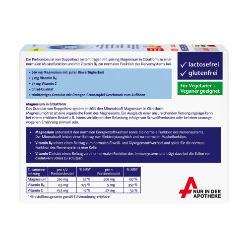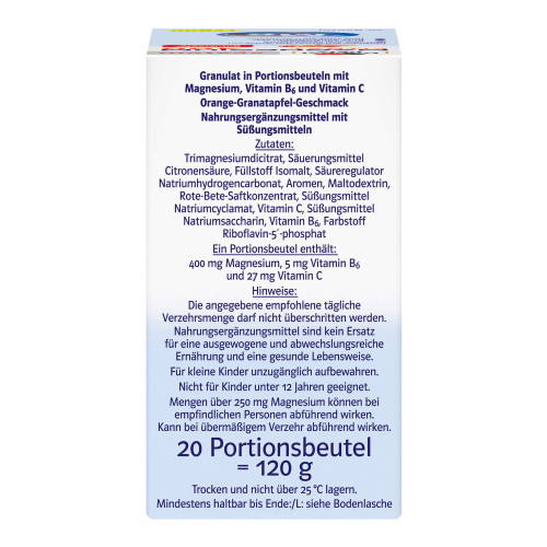 Trimagnesiumdicitrat, Säuerungsmittel Citronensäure, Füllstoff Isomalt, Säureregulator Natriumhydrogencarbonat, Aromen, Maltodextrin, Rote-Bete-Saftkonzentrat, Süßungsmittel Natriumcyclamat, Vitamin C, Süßungsmittel Natriumsaccharin, Vitamin B6, Farbstoff Riboflavin-5-phosphat.