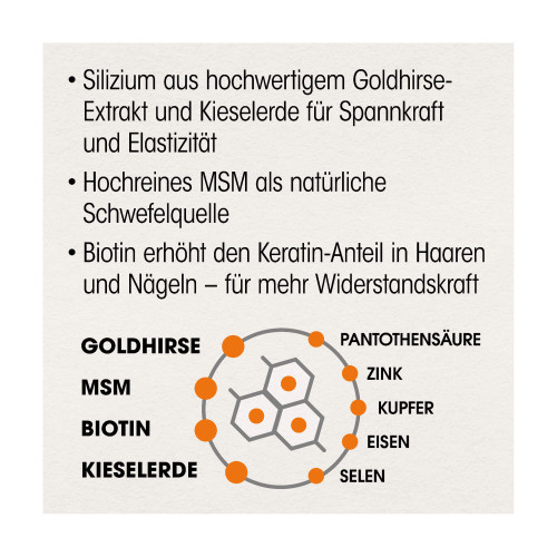 Kieselerde, Zucker, Füllstoff Cellulose, Goldhirse-Extrakt, Zinkgluconat, Überzugsmittel Hydroxypropylmethylcellulose, Füllstoff Natrium-Carboxymethylcellulose, Methylsulfonylmethan (MSM), Überzugsmittel Schellack und Methylcellulose, Eisenfumarat, D-Biotin, Natriumselenat, Trennmittel Magnesiumsalze der Speisefettsäuren, Kupfergluconat, Calcium-D-pantothenat, Trennmittel Talkum.