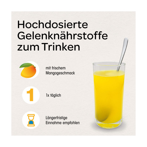 Maltodextrin, Säuerungsmittel Citronensäure, Glucosamin aus dem Chitin der Krebstiere, Chondroitinsulfat-Natrium, Calciumcarbonat, Magnesiumsalze der Zitronensäure, Kollagenhydrolysat (Ursprung: Huhn), Vitamin C, Aroma (Maracuja, Mango), Methylsulfonylmethan, DL-α-Tocopherylacetat, Farbstoff Betacarotin, Süßungsmittel Cyclamat, Natriumselenat, Traubenkern-Extrakt, Vitamin D3, Mangansulfat, Süßungsmittel Saccharin, Emulgator Sojalecithin.