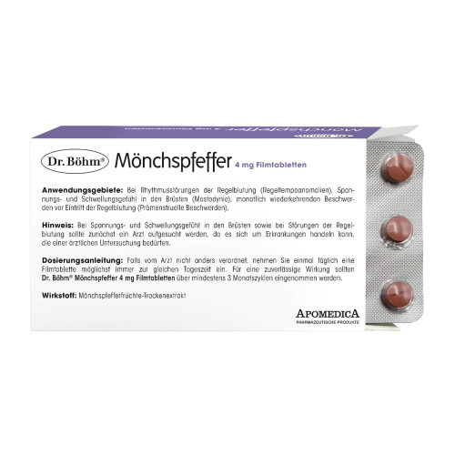 Dr. Böhm Mönchspfeffer 4 mg Filmtabletten. Wirkstoff: Trockenextrakt aus Mönchspfefferfrüchten. Anwendungsgebiete: Bei Rhythmusstörungen der Regelblutung (Regeltempoanomalien), Spannungs- und Schwellungsgefühl in den Brüsten (Mastodynie), monatlich wiederkehrenden Beschwerden vor Eintritt der Regelblutung (Prämenstruelle Beschwerden). Warnhinweis: Enthält Lactose.