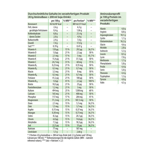 Für den Mahlzeitersatz: Für eine Portion (entspricht einer Hauptmahlzeit) ist folgende Zubereitung zu beachten: 43 g AminoBase (entspricht ca. 4 gestrichenen Messlöffeln) mit 200 ml Soja-Drink (mit 2,3 g Zucker und 120 mg Calcium pro 100 ml) anrühren. Nach Geschmack mit SteviaBase süßen.