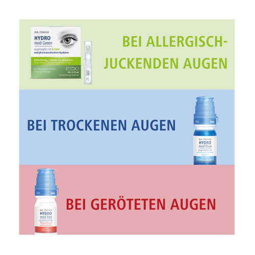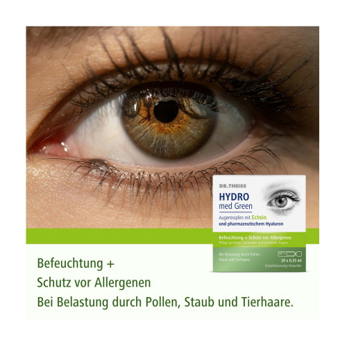 Allergische Augenbeschwerden werden häufig durch den Flug von Pollen, Staub oder Tierhaaren verursacht und äußern sich in trockenen, juckenden und brennenden Augen. Die HYDRO MED Green Augentropfen von Dr. Theiss mit Ectoin und pharmazeutischem Hyaluron bilden eine Art "Schutzschild" vor Allergenen aus der Umgebungsluft und pflegen die gereizten, juckenden Augen. Die Augen werden befeuchtet und vor Allergenen aus der Umgebungsluft geschützt.