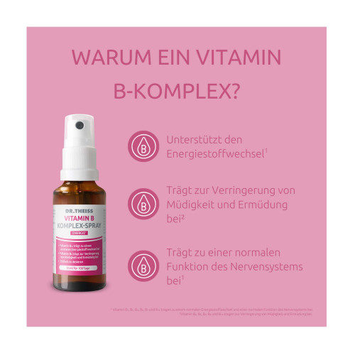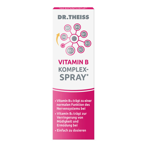 Das Dr. Theiss Vitamin B Komplex-Spray kombiniert gleich sieben B-Vitamine: B1, B2, B3, B5, B6, B7 (Biotin) und B12. Damit unterstützt es gezielt die tägliche Vitaminaufnahme – besonders dann, wenn es schnell und unkompliziert gehen soll.