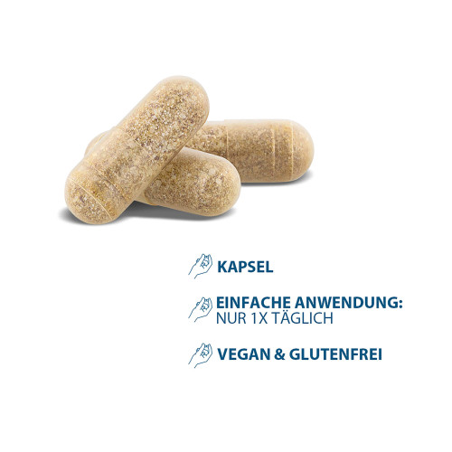 Täglich eine Kapsel morgens mit einem großen Glas Wasser einnehmen. Empfohlener Einnahmezeitraum: 3 Monate.