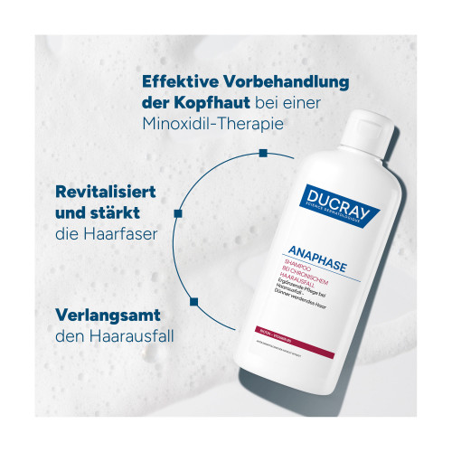 Das DUCRAY ANAPHASE Shampoo bei chronischem Haarausfall von DUCRAY bereitet die Kopfhaut effektiv auf die Behandlung gegen chronischen Haarausfall vor. Es verbessert die Wirkung von Therapien gegen Haarausfall, spendet Volumen, sorgt für eine Kräftigung von dünnem, lichter werdendem Haar und beugt dem Haarausfall vor. Das ANAPHASE Shampoo kann sowohl in der Kombination mit Minoxidil verwendet werden als auch als Monotherapie.