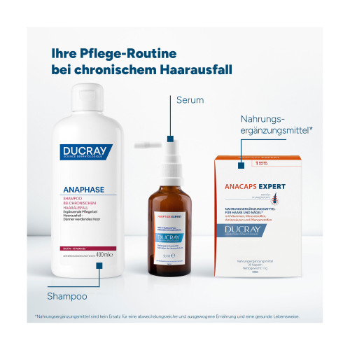 3x die Woche DUCRAY ANAPHASE Shampoo bei chronischem Haarausfall, 3x die Woche NEOPTIDE EXPERT Serum (PZN 17945874) und 1x täglich Nahrungsergänzungsmittel (Ducray ANACAPS EXPERT - PZN 17885043).