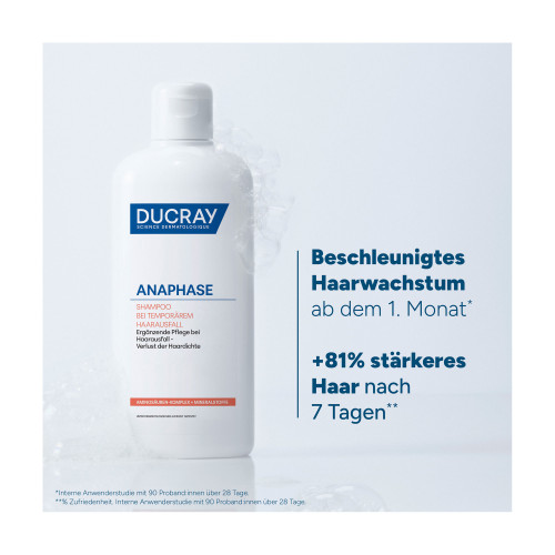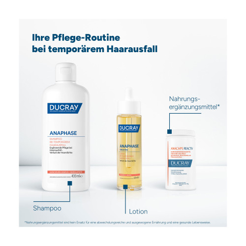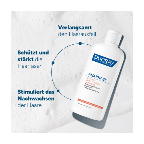Das ANAPHASE Shampoo wurde speziell als Ergänzung für eine Behandlung bei temporärem Haarausfall entwickelt. Bei temporärem Haarausfall wird ergänzend die ANAPHASE CREASTIM Lotion von Ducray empfohlen.