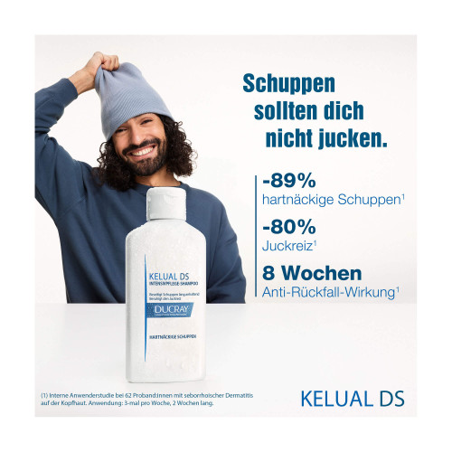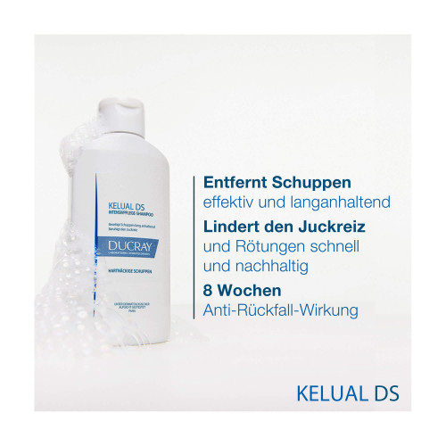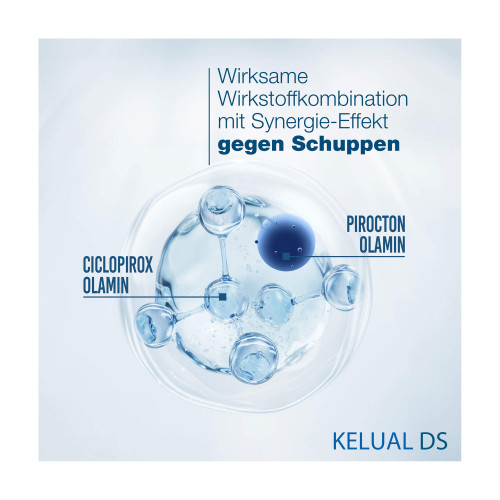 Das KELUAL DS Anti-Schuppen Intensivpflege-Shampoo wirkt dank patentierter Aktivstoff-Kombination aus Ciclopirox Olamin + Pirocton Olamin auf die Faktoren, die für die Entstehung hartnäckiger Schuppen verantwortlich sind und beugt Rückfällen 8 Wochen* lang vor.