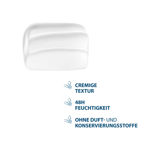 Die Haut wird beruhigt, 48 Stunden lang mit Feuchtigkeit versorgt und die Anzeichen von Trockenheit werden sichtbar reduziert.